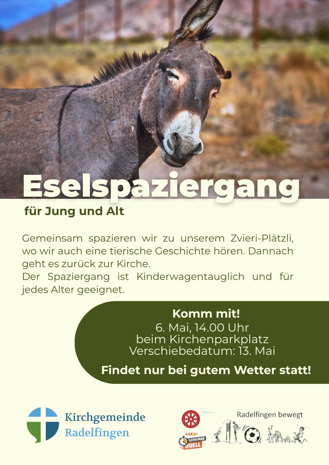 Gemeinsam spazierren wir zu unserem Zvieri-Plätzli, wo wir auch eine tierische Geschichte hören. Danach geht es zurück zur Kirche. Der Spaziergang ist kinderwagentauglich und für jede Alter geeignet.